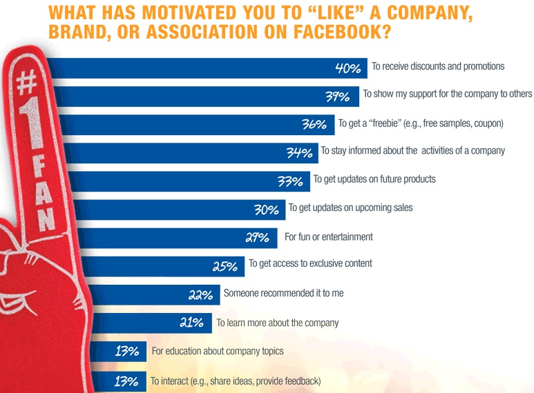 Από τις έρευνες που γνωρίζω ο βασικός λόγος για τον οποίο κάποιος κάνει 'Like' σε μια Facebook Page είναι για να επωφεληθεί από διάφορες προσφορές, εκπτώσεις και κουπόνια. Και λογικό δεν είναι; Για ποιο άλλο λόγο να γίνω μέλος στη σελίδα μιας πιτσαρίας ή ενός super market; Τι συναισθηματικούς δεσμούς μπορεί να έχω με μια τέτοια επιχείρηση ώστε να αισθάνομαι υποστηρικτής ή φανατικός πελάτης της; Κανέναν είναι η απάντηση. Έχω σημαντικότερα πράγματα να με απασχολούν.